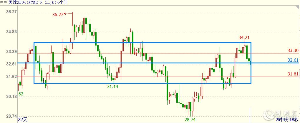 今天3月份合约切换到4月份合约,从上方4月份合约4小时图观察,昨天油价冲高至上方箱体上沿附近承压下行,目前又回到了箱体中轴附近,如果中心轴线32.61美元(海峡油2135)支撑被跌破,那油价将继续下行。上方压力33.3美元(2180附近),下方支撑31.6美元(2070附近),由于合约切换,两个合约之间有差价,今天或向下回落添补差价,故今天以逢压力位做空为主。