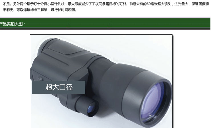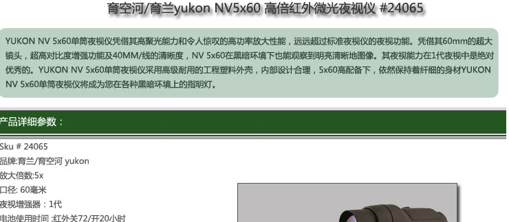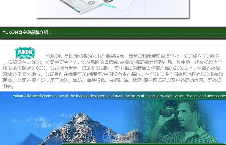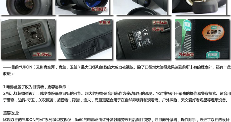 ——目前YUKON(又称育空河,育兰,玉兰)大口径和倍数的大威力夜视仪。除了口径增大使得效果达到前所未有的程度外,还有一些改进:
