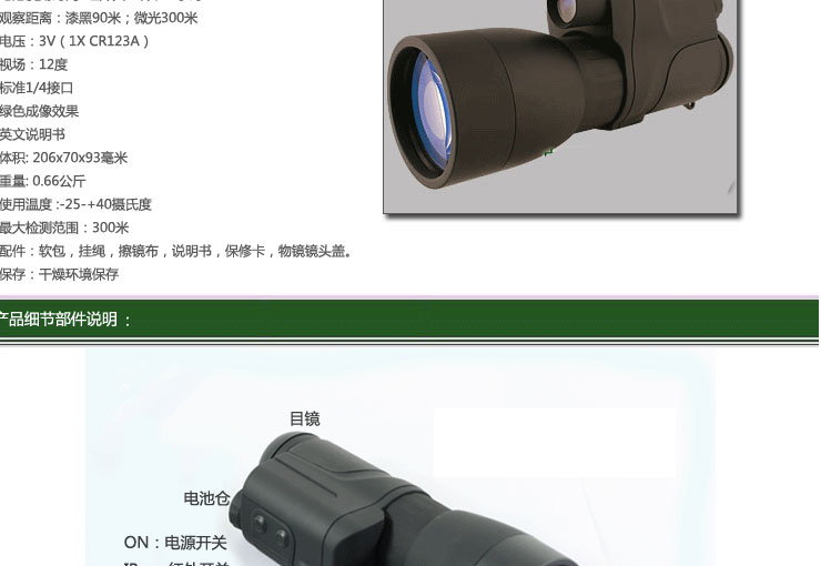 比起以往的YUKON的MT系列微型夜视仪,5x60的电池仓由红外发射器旁改到后面目镜旁,并且向外倾斜,操作顺手,改进了以往的设计不足。另外两个指示灯十分微小呈针孔状,大限度减少了了夜间暴露目标的可能。前所未有的60毫米超大镜头,进光量大,保证图像清晰明亮。可以连接标准三脚架,进行长时间观测。 产品详细参数: 观察放大倍数 5 物镜直径 60mm 观察距离 漆黑3-90米 微光3-300米 视场 12 主动红外 有 温度 -25-- 40 夜视增强器 1代 中心分辨率 40 电源类型 3V锂电(自备) 视频输出 无 重量 0.66kg 尺寸 206*70*93(mm) 产地 白俄罗斯 说明书 英文 三脚架接口 有,接环罗口1/4寸 保修期限 一年