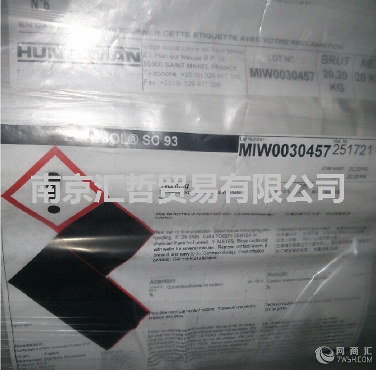 Huntsman亨斯迈磺酸钠表面活性剂,活性物质含量高,Na2SO4及水含量小,不含二价金属离子,适用于高要求的日化、水处理、清洗、洗涤等工业中。 Huntsman亨斯迈表面活性剂: ELTESOL CA;ELTESOL PA;ELTESOL TA;ELTESOL XA;ELTESOL AC;ELTESOL AX;ELTESOL PSC;ELTESOL PX;ELTESOL SC;ELTESOL ST;ELTESOL SX。 助溶剂,助溶性佳,增加配方流动性。 STEPANATE SCS40 异丙苯磺酸钠40 液体 STEPANATE SXS40 二甲苯磺酸钠40 液体 美国Huntsman亨斯迈原装进口,93.0%min.,20kg/袋;30kg/袋,法国产。 Huntsman ELTESOL SX93 二甲基苯磺酸钠Sodium xylene sulphonate:家用化学品、工业清洗剂、个人护理品,水溶助长剂,适用于高浓缩配方 Huntsman ELTESOL ST93 对甲基苯磺酸钠Sodium toluene sulphonate:家用化学品、工业清洗剂、个人护理品、浓缩产品,水溶助长剂,适用于高浓缩配方 Huntsman ELTESOL SC93 异丙基苯磺酸钠Sodium cumene sulphonate:家用化学品、工业清洗剂、个人护理品