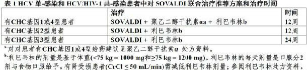 【英文名称】 SOVALDI 【中文名称】 索非布韦片 【成 分】丙型肝炎病毒(HCV)核苷酸类似物NS5B聚合酶抑制剂 【性 状】 黄色胶囊 【规 格】 400mg 【 适应症 】SOVALDI是一种丙型肝炎病毒(HCV)核苷酸类似物NS5B聚合酶抑制剂适用为的治疗慢性丙型肝炎(CHC)感染作为抗病毒联合治疗方案的组分。 在有HCV基因1,2,3或4型感染受试者中已确定SOVALDI疗效,包括那些有肝细胞癌符合米兰[Milan]标准(等待肝移植)和有HCV/HIV-1共-感染受试者。 当开始用SOVALDI治疗应考虑以下几点: u 为CHC治疗建议不用SOVALDI单药治疗。 u 治疗方案和时间依赖于病毒基因型和患者群两方面。 u 根据基线宿主和病毒因子治疗反应变化。 【用法用量】SOVALDI的推荐剂量是400 mg片,口服,每天1次有或无食物。在成年中为CHC的治疗SOVALDI应与利巴韦林联用或与聚乙二醇化干扰素和利巴韦林联用。 表1提供对SOVALDI联合治疗推荐的方案和治疗时间。 SOVALDI与利巴韦林联用共24周对CHC有基因1型感染患者是接受基于干扰素方案不合格可被考虑为一种治疗选择应通过对个体患者潜在获益和风险的评估指导治疗决策。 【 禁忌症 】当SOVALDI是与利巴韦林或聚乙二醇干扰素α/利巴韦林联用,应用至这些药物的禁忌证也应用至联合治疗。对其禁忌证清单参阅聚乙二醇干扰素α和利巴韦林处方资料。 妊娠或可能成为妊娠妇女和男性其女性伴侣是妊娠禁忌SOVALDI与利巴韦林或聚乙二醇干扰素α/利巴韦林联合治疗因为伴随用利巴韦林出生缺陷和胎儿死亡。 【注意事项】利巴韦林可能致出生缺陷和/或被暴露胎儿死亡和动物研究曾显示t干扰素有流产效应[见禁忌证(4)]。在妇女患者和男性患者的女性伴侣必须极小心避免妊娠。 利巴韦林治疗不应开始除非开始治疗前立即已得到阴性妊娠测试报告。 当SOVALDI是与利巴韦林或聚乙二醇干扰素α/利巴韦林联用,有生育能力妇女和其男性伴侣在治疗期间和已结束后至少6个月必须使用两种形式有效避孕。在这个时间必须每月进行常规妊娠测试。没有妇女服用SOVALDI全身激素避孕药有效性的数据,因此,治疗用SOVALDI和同时利巴韦林期间应使用两种非激素避孕方法。