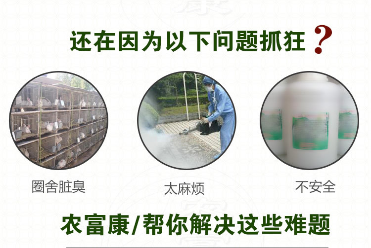 解决兔舍氨气重、臭味大的方法很简单,只需用农富康除臭消毒液兑水,用喷雾器把兔舍彻底喷一遍,当天明显感觉臭味小、氨气减少,效果持续7-10天,长期使用只需1月喷2次即可。