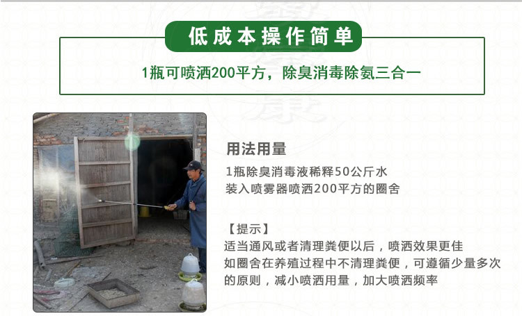 除臭消毒液主要成分是乳酸菌、酵母菌、光合细.菌、芽孢杆菌等有益菌,喷洒到兔舍后,有益菌跟有害菌不能共存,除臭消毒液中有益菌数量多可以清除兔舍里有害杂菌,达到杀菌消毒的作用,杂菌被清除,不会再分解兔分产生氨气,等于斩断根源;另一方面乳酸菌、光合菌可以转化兔舍里已产生的氨气,从而减少氨气臭味。喷洒时兔粪残余多的地方可适当多喷,益生菌喷洒到兔舍后可以一直在里边繁殖,所以除臭、除氨气效果持续时间长一般在7-10天,长期喷洒效果可持续10-15天。