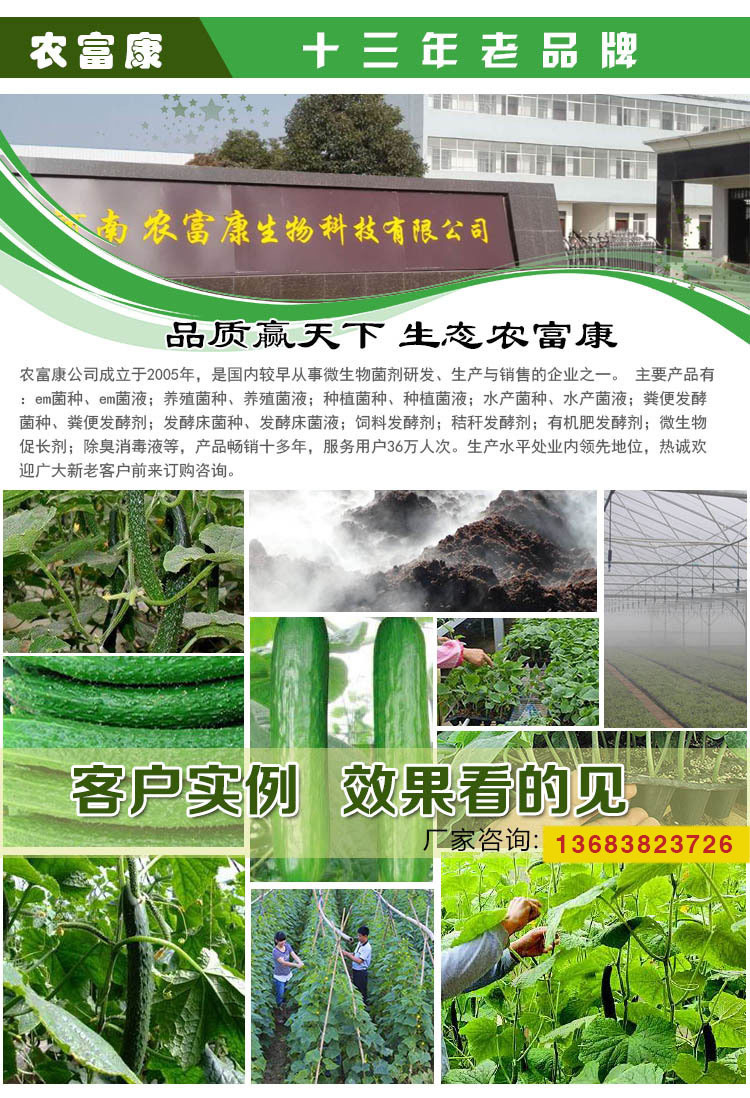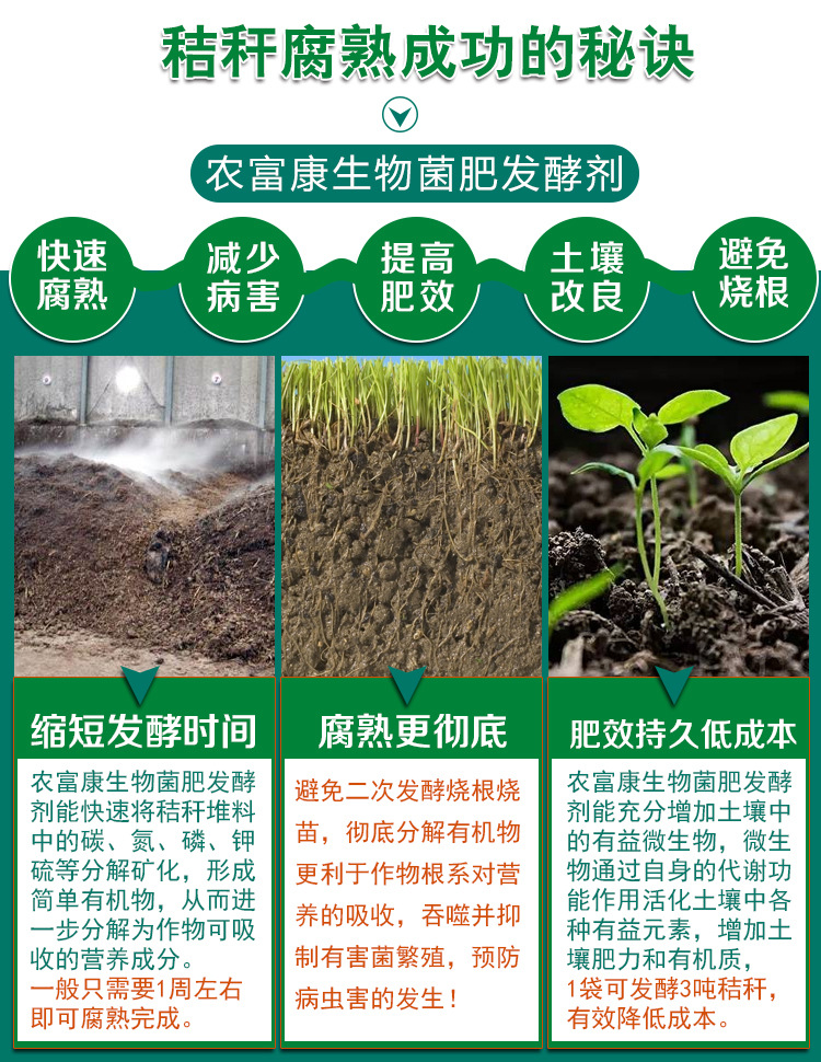 农富康生物菌肥发酵剂主要由芽孢杆菌,乳酸菌,光合作用菌,酵母菌,放线菌等多种有益菌经特殊工艺研制而成的复合微生物菌,一袋可以发酵3吨的秸秆,农富康经过14年的发展改进,目前已经直供多家大型有机肥生产基地和厂家,它的效果是现在任何一家生物菌肥厂家不可比拟的!农富康厂家直销 24小时订购热线:136-8382-3726 (微信-同号)
