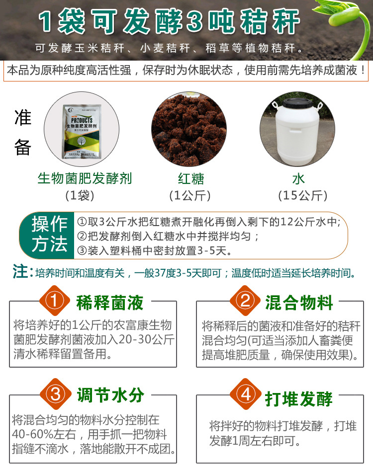 1.有机肥发酵剂为休眠原菌,需要简单的激活才能使用。
