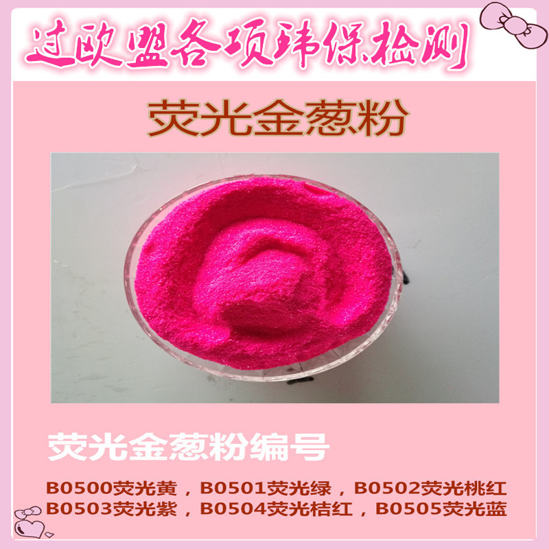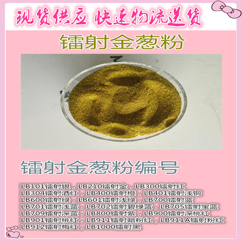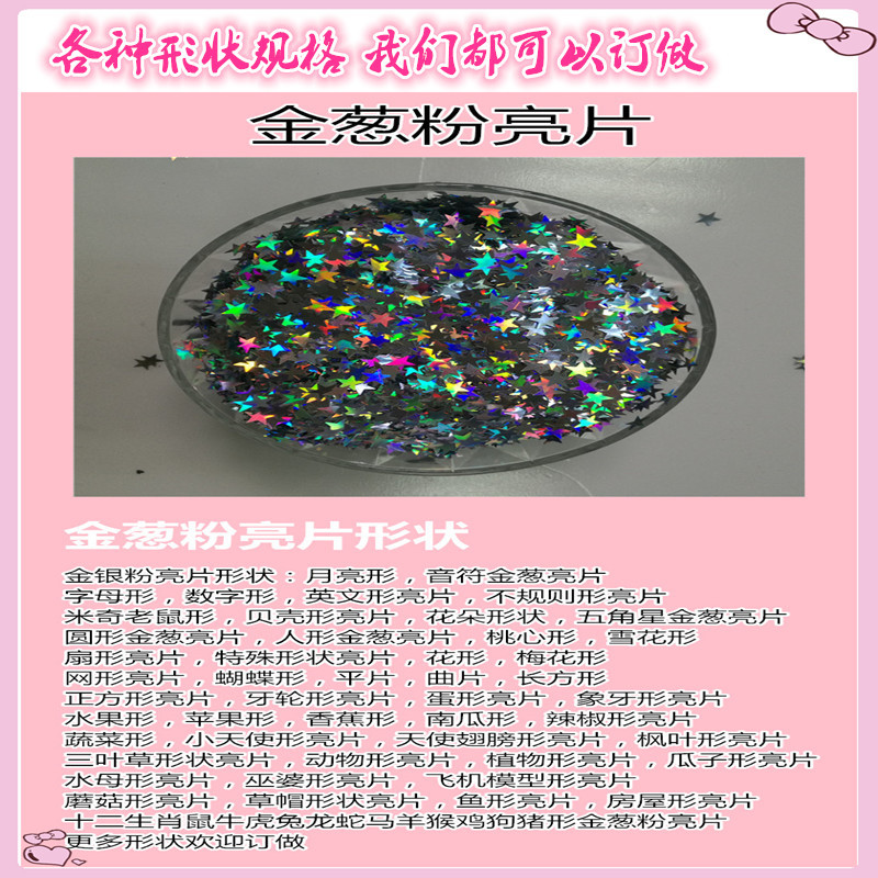 金葱粉(glitter),也叫闪光片,闪光粉,由于规格大的也叫金葱亮片由精亮度极高的不同厚度的PET、PVC、OPP金属铝质膜材料电镀,涂布经精密切割而成。 金葱粉粒径可从0.004mm-3.0mm均可生产。环保的当属PET材质的了。其形状有四角形、六角形、长方形等、棱形等。金葱粉色系分为镭射银、镭射金、镭射彩(包括红蓝绿紫桃红黑)银色、金色、彩色(红蓝绿紫桃红黑)幻彩系列。各色系均加上表层保护层,色泽光亮,对气候,温度的轻度腐蚀性化学品具有一定抵抗力及耐温性。