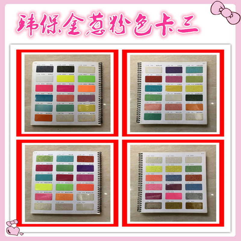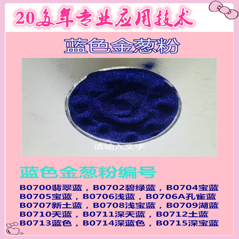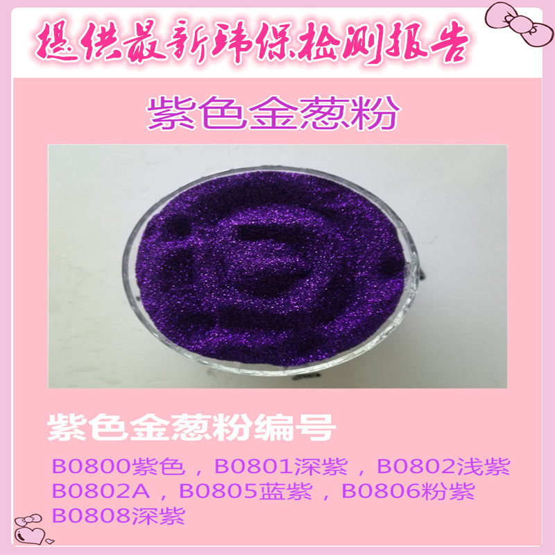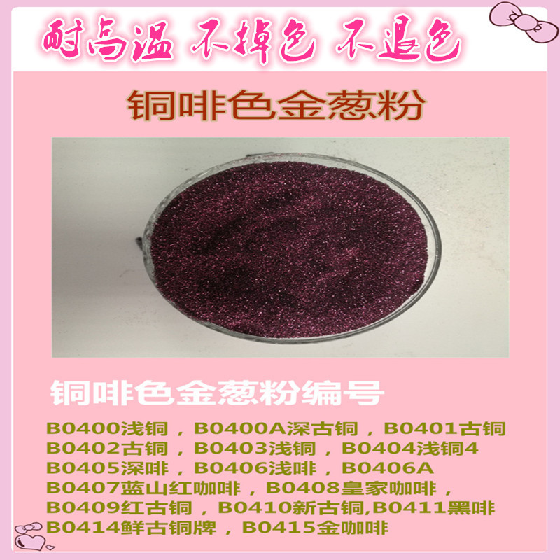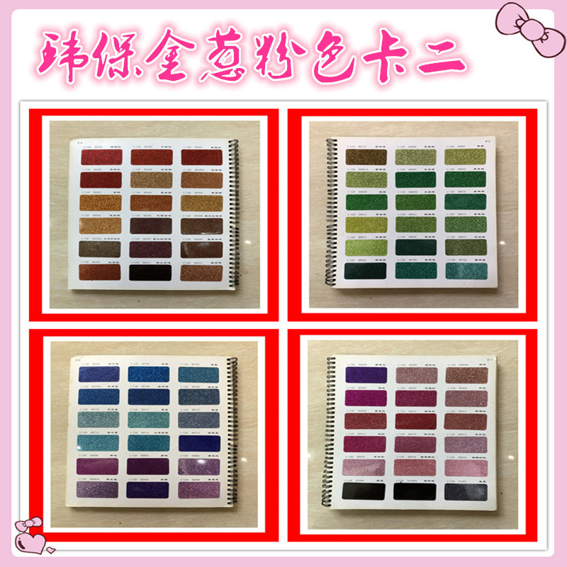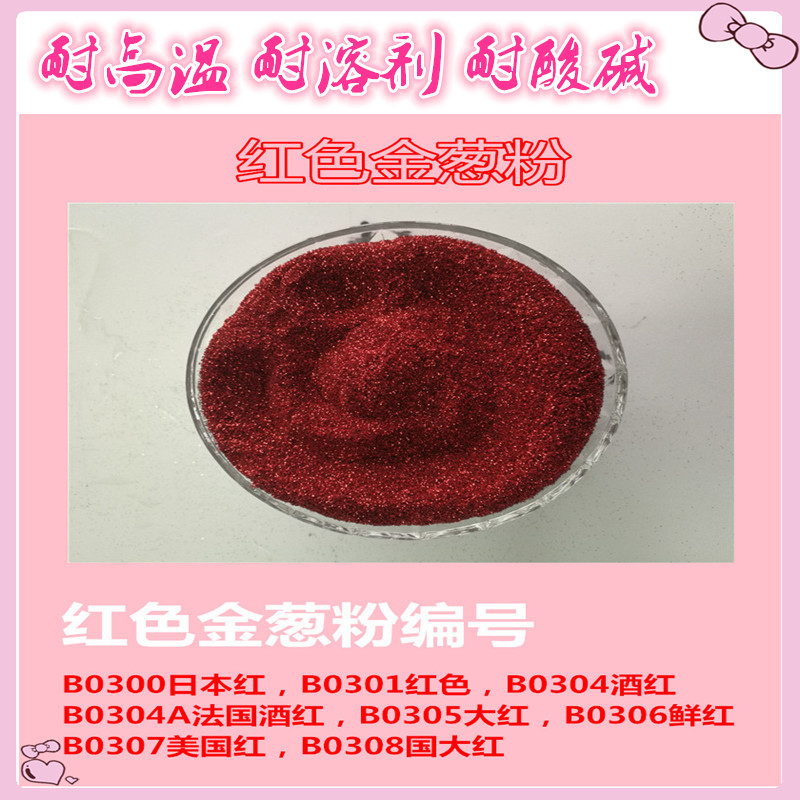 该产品用极薄的铝箔组成,其彩色外层为热固交叉结合环氧层。金葱粉(glitter)适用于许多可溶性材料,也可干涂。金属质金葱粉是用于塑料制品的理想材料,耐温为250℃、耐酸碱。