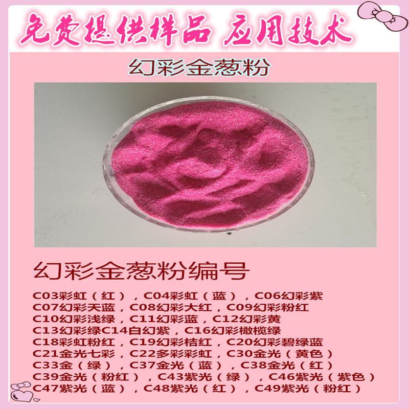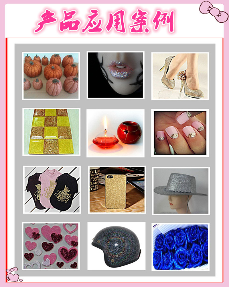 作为一种效果独特的表层处理材料,金葱粉广泛应用于圣诞工艺品、蜡烛工艺、化妆品、丝网印刷行业(布料、皮革类、制鞋类---鞋材类、年画系列)、装饰材料(工艺玻璃艺品、聚晶玻璃;晶图玻璃水晶球)、油漆装潢、家具喷漆,包装,圣诞礼品,玩具笔等领域,其特点在于增强产品的视觉效果,使装饰部分凹凸有层次,更具立体感。而其高度闪光的特性,更使得装饰物鲜艳夺目、倍添光彩。