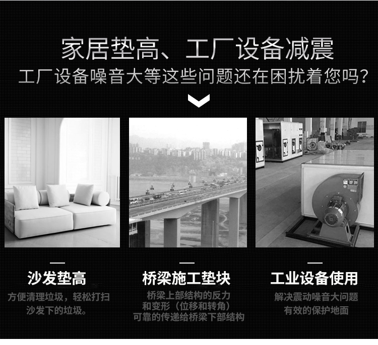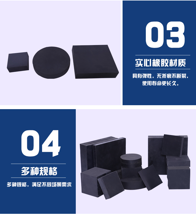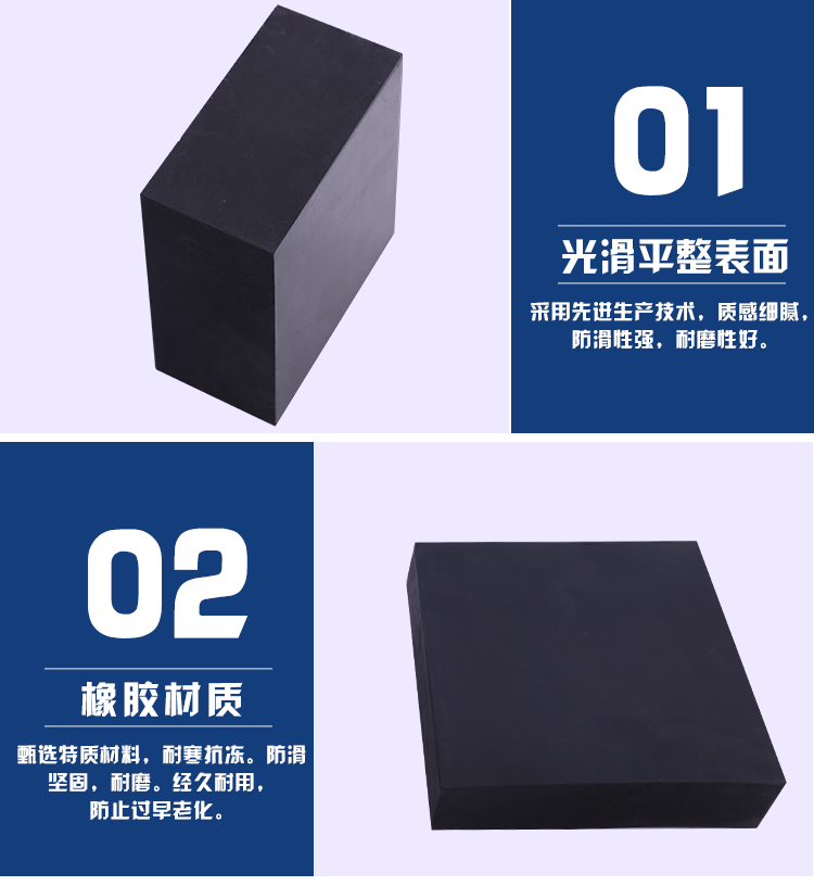 桥梁橡胶缓冲垫块橡胶方块 板式橡胶支座由多层橡胶与薄钢板镶嵌、粘合、硫化而成的一种桥梁支座产品。该种类型的橡胶支座有足够的竖向刚度以承受垂直荷载,且能将上部构造的压力可靠地传递给墩台;有良好的弹性以适应梁端的转动;有较大的剪切变形以满足上部构造的水平位移。 板式橡胶支座病害制造与施工的原因