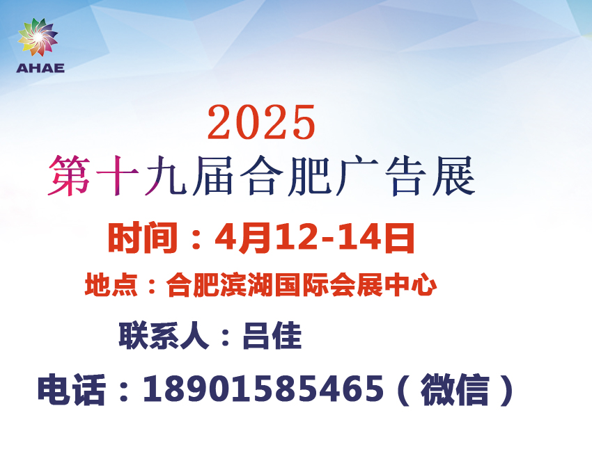 参展咨询:吕佳18901585465(微信同号) Q Q:444309712 2025第19届合肥广告展览会 时间:2025年4月12-14日 地点:合肥滨湖国际会展中心 欢迎参加 2025第十九届合肥广告展览会 22000平方米展出面积,超18000人次专业观众参观。 日程安排 布展时间:2025年4月10—11日 展出时间:2025年4月12—14日 撤展时间:2025年4月14日下午14:00 展览范围 一、 数字印刷喷绘技术设备 ★ 数字喷印设备、写真设备、打印设备及各种喷头、软件 ★ 数字影像技术设备、数字印刷设备等 二、数字标识、标牌系统及标识标牌设备与材料 ★ 激光雕刻机、CNC雕刻系统 ★ 数字标牌、标识设备及材料 ★ 亚克力设备及材料等 ★ 触摸一体机,交互式触控系统 三、展览展示、POP及商用设施 ★ 展览展示器材,各种展具、展板系列、便携式展具系列、球架、桁架、太空结构架 ★ 商业空间设计及装饰技术设备 ★ 商业自动化技术设备:POS系统、条码扫描、打印机系统、自动提款机、物流管理系统、管理软件及解决方案 四、LED ★ 大屏幕(CDT)显示器、监示器; ★ 大屏幕(LED)显示设备及LED器件 ★ 等离子体(POP)显示器及显示屏; ★ 大屏幕液晶(LCD)显示设备及显示屏 ★ 大屏幕彩色电视机(高清晰、多画面、多媒体、图文及数字电视) ★ 大屏幕投影机(背投式投影电视机、前投式投影机) ★ 有机电致发光平板(EL)、场致发光显示(FED)、真空银光显示(VFD)、电泳显示(EP) 和各种光阀显示设备等 五、广告摄影打印技术设备及耗材 ★ 输入设备、数码产品 ★ 输出设备:打印机、打印耗材、扫描仪等 ★ 影像器材及耗材打 六、新媒体技术设备 ★ 网络媒体广告、互动媒体广告、动漫广告 ★ 直邮(DM)媒体广告 ★ 新媒体、网络媒体、多媒体广告设计制作技术及设备等 ★ 广告、包装、印刷创意创新设计作品及其制作软件 ★ 创意创新设计工业园、多媒体技术制作中心 您将在展会期间获得: 了解——安徽省广告设备/LED/标识标牌/材料市场发展的新动向 接触——安徽省广告行业的重要客户/买家 推广——参展企业/产品/服务,提高知名度 行销——广告新设备、新产品、新技术、新材料 展会参展费用标准 类 别 配 置 价 格 标准展位 3?3m,标准配置 5800人民币元/个 光 地 36㎡起租,不配置任何设施 580人民币元/㎡ 说明: 1、标准展位的配置:三面白色展板(高度2.5米)、中文楣板、2盏射灯、1张咨询桌、2张折椅及1只电源插座(220V 5A)。另外标准展转角展位均加收10%的费用。 2、展位费指展商租用标准展位或光地的费用,不包含展品的运输仓储、吊装就位、展具租赁、现场水电气租用、特别装修搭建及其管理费等费用。 3、技术讲座提供会议场地、照明、音响、桌椅、饮水、投影仪,不包含会场布置或其他特别安排的费用。