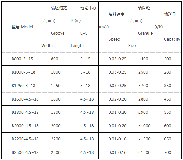 产品简介 板式给料机是一种散状物料的输送设备,这种设备既能输送颗粒粒度在5mm以下的细物料,也能输送1m以上的大块物料。具有适应性强、可调节输送能力和连续均匀输送各种物料的功能。在矿山、建材、化工、冶金等工作部门得到广泛应用。 板式给料机具有牵引 力大、功耗小、磨损小、漏料少、运行平稳、工作可靠使用寿命长、检修方便等突出的优点。 产品分类 板式给料机可分为:轻型板式给料机、中型板式给料机、重型板式给料机; 1、轻型板式给料机允许输送堆积密度不大于 1200kg/m?,块重不超过140kg,温度不高于 350℃的块 状和颗粒状物料 ; 2、中型板式给料机允许输送堆积密度不大于 2400kg/m?,块重不超过 500 kg,温度不高于 400℃的块 3、 重型板式给料机用于由贮料仓向破碎机、输送机或其它机械连续和均匀给料,也可用于短距离输送块度与密度较大的物料,可水平安装,也可倾斜安装。 选型参数 表一 轻型板式给料机参数表 Table 1:Table of parameters of light plate feeder 表三 重型板式给料机参数表 Table 3:Table of parameters of heavy duty plate feeder