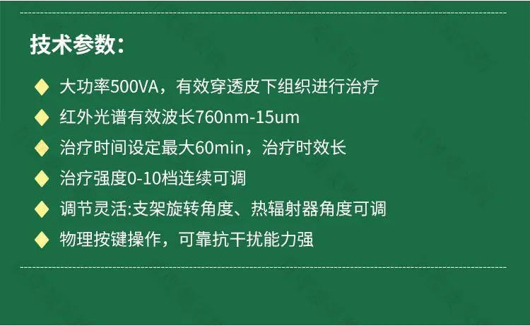 红外治疗仪能量主要分布在具有治疗价值的波段(760-1400nm),极强的能量治疗深度且对人体无副作用,放心治疗。 大幅滤过了致热性强的波段,提升患者在高能量光波治疗过程中的安全性和耐受性。 配备人性化设计的定距杆,限定很小治疗距离,提高患者在治疗过程的安全性。 能输出人体可耐受的巨大光功率密度,有效穿透深度375px以上,实现深部消炎、快速止痛。 采用进口的卤素光源及特制过滤液的过滤系统,提升治疗效果。宽大的治疗面积,提高临床使用效率。 红外治疗仪临床应用: 主要用于对疼痛和炎症的治疗,能改善血液循环,促进组织修复。如: 慢性退行性疾病:颈椎病、椎间盘突出(颈椎、腰椎)、骨质疏松、慢性关节炎、外伤性关节炎、老年性关节炎、强直性脊柱炎等 软组织、韧带损伤:落枕、肌肉性头痛、肩部、手臂疼痛、慢性疲劳症、肌肉纤维痛、网球肘、运动损伤性疼痛、颈肩肌肉拉伤,颈部疼痛、肩部僵硬、骶骨关节综合征等 风湿性病变:慢性风湿炎症、类风湿性关节炎、关节炎(肩关节炎,膝关节炎,髋关节炎)等 神经性病变:胸壁神经痛、肋间神经痛、坐骨神经痛、腰膝综合征、慢性神经炎,颈椎、腰椎增生所致神经压迫等引发疼痛炎症类 皮肤科疾病:带状疱疹后遗神经痛、下肢丹毒、皮肤软组织感染、蜂窝组织炎、湿疹、过敏性皮炎等妇科疾病:慢性盆腔炎、慢性附件炎、促进盆腔积液吸收、缓解痛经、乳腺炎、乳腺增生、子宫复旧等 呼吸系统疾病:肺炎、支气管炎、支气管扩张、过敏性咳喘、哮喘、慢性阻塞性肺疾病等 消化系统疾病:慢性胃炎、消化不良、消化性溃疡等